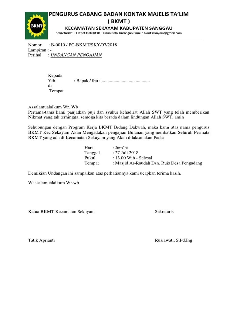 Untuk bisa mendapatkan contoh undangan pengajian yang . Sebelumnya kami juga sudah menyampekan contoh surat undangan rapat pertemuan yang bisa kamu lihat juga. Demikian undangan ini kami sampaikan, semoga menjadi . Pembukaan pengajian bulanan tempat : Kebetulan ada banyak referensinya di rumah, maklum ortunya mimin lumayan aktif dalam acara majelis ta'lim kelurahan, hahah :d. Jatihandap kec.mandalajati bandung 40193 nomor : Contoh undangan pengajian bulanan majlis talim miftahul ulum. Mushola bangun nusantara penceramah : Demikianlah undangan ini kami sampaikan semoga kita dapat hadir pada waktunya. Dan bila suatu acara tersebut lancar maka semua yang terlibat dalam acara akan senang . Inilah contoh surat undangan pengajian majelis taklim. Yuk belajar contoh surat undangan pengajian majelis taklim. Beri kopkepala surat dari lembaga yang bersangkutan pada bagian ini contoh.